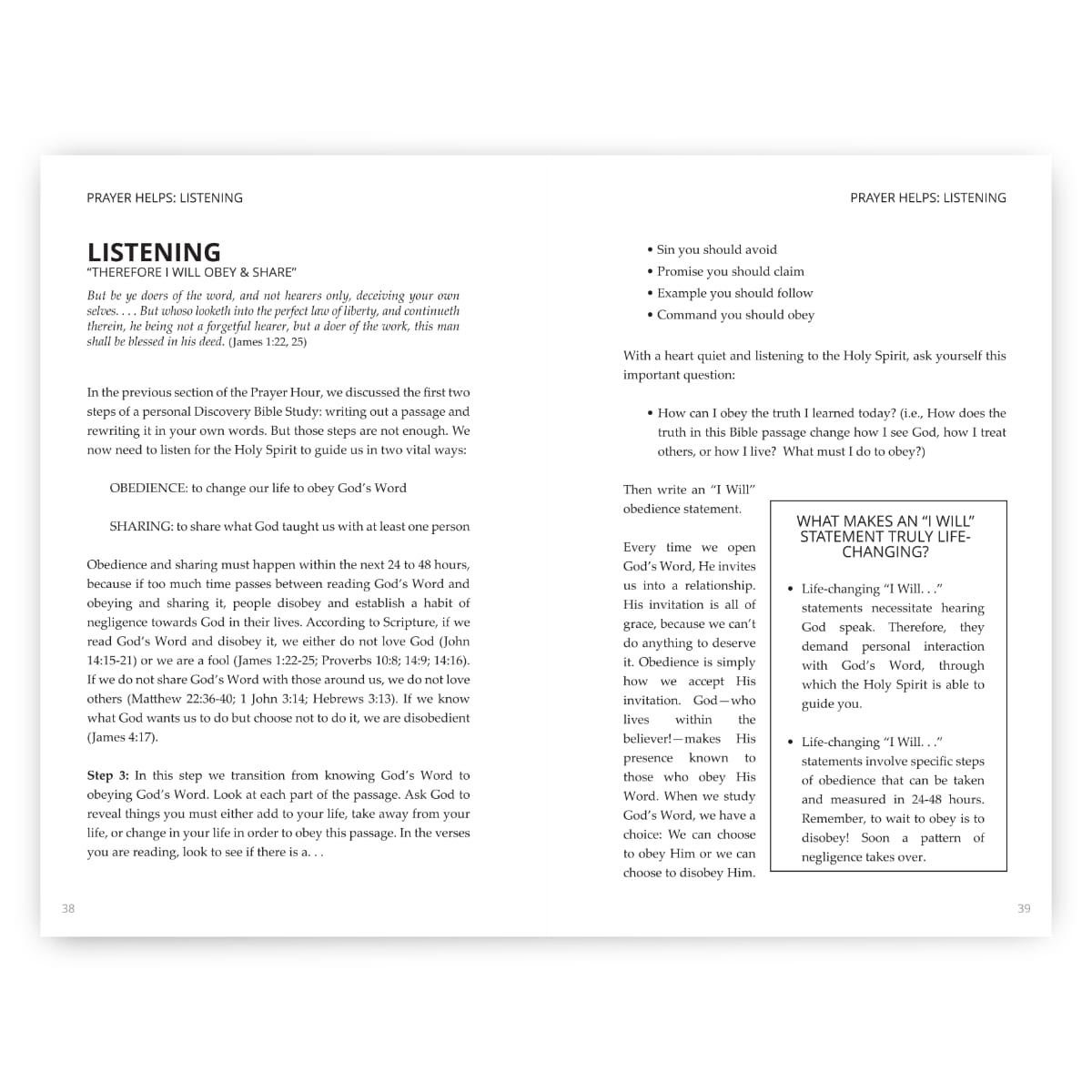 Prayer Helps Section: A guide for you in your time with God. Specific helps are given to move you through the various aspects of prayer and meditation on the Word of God.